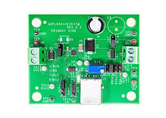 Una scheda di valutazione progettata per il limitatore di corrente ADPL86610 da 250 mA, che fornisce capacità di prova e sviluppo complete per le soluzioni incorporate.